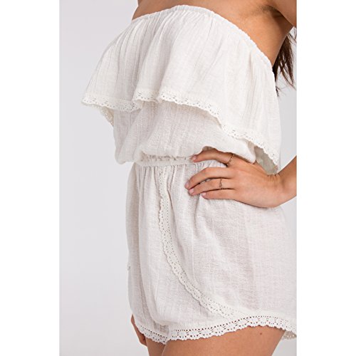Product DescriptionStrapless woven gauze romper with elastic encased at waist, crochet trim detail and overlap detail at shorts.0