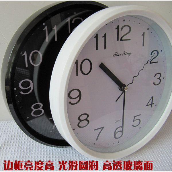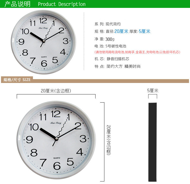 高等塑料边框(ABS工程塑料),玻璃镜面,PVC数字面,钟面直径20厘米。
