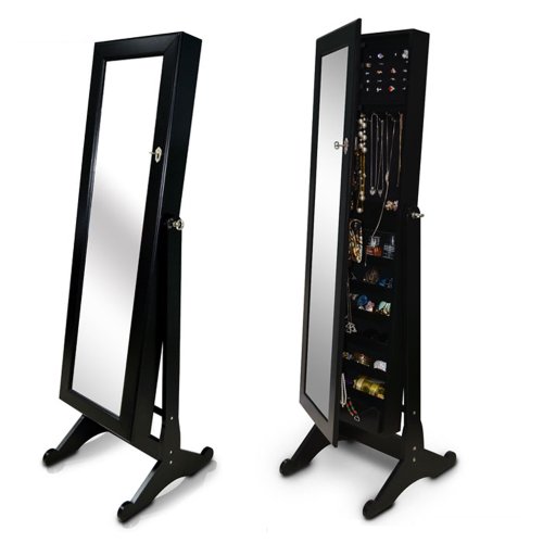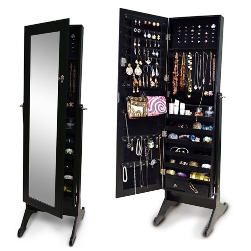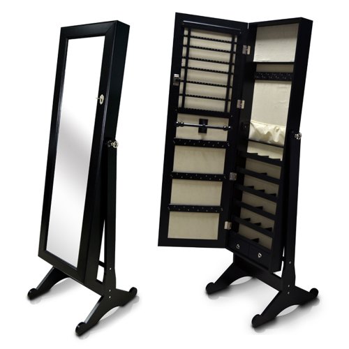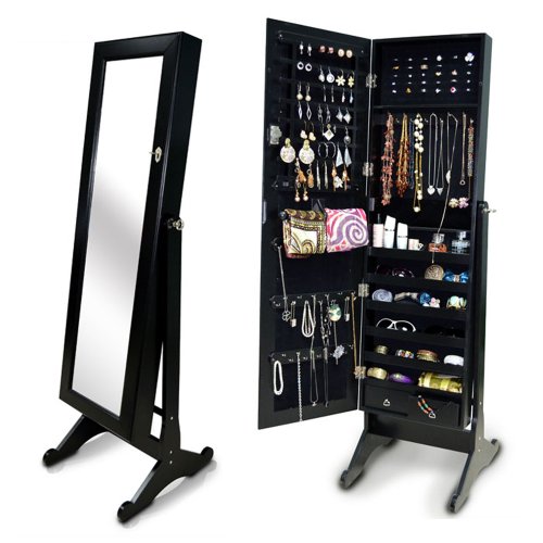 This stylish piece of Jewelry Armoire is great for ladies that love their jewelry displayed in a classy way. It makes it easy to choose your beauty jewelry in the morning without the frustration of looking for loose/missing pieces. It stores all of your jewelry safely with lock and in a organized manner. It features an elegant, space-saving design MDF wood construction, large size full length mirror and 2 small drawers.