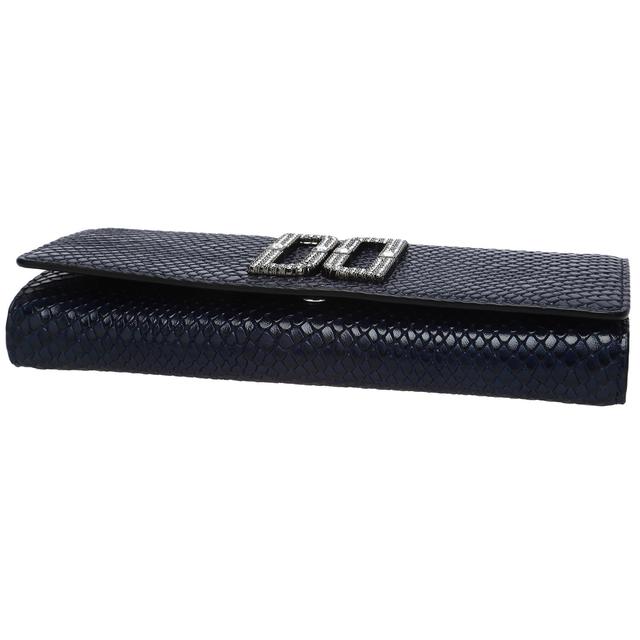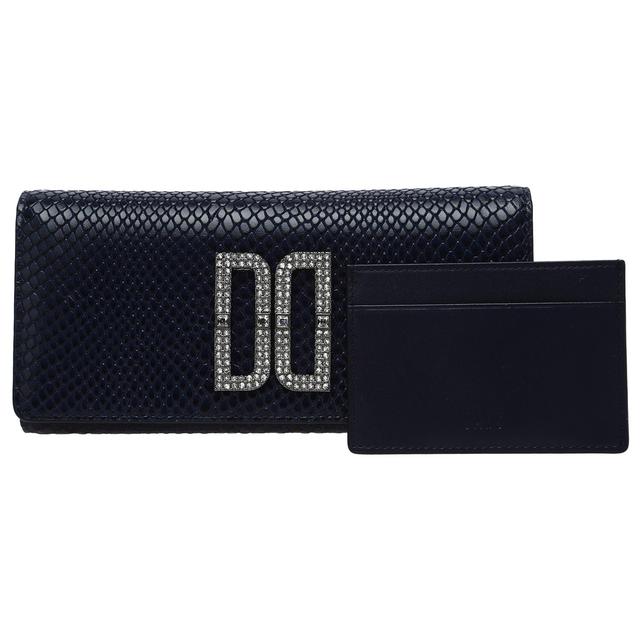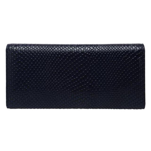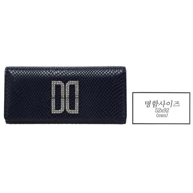 네이비 컬러에 뱀피 무늬가 고급스러운 분위기를 연출하는 장지갑입니다. 별도의 카드홀더가 포함되어 활용도를 높인 제품입니다.
