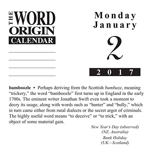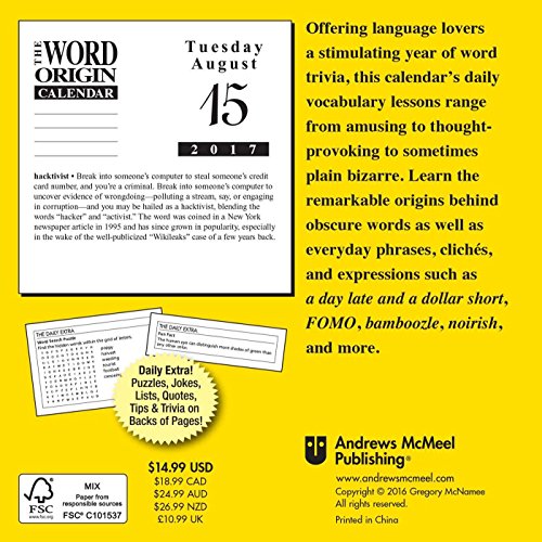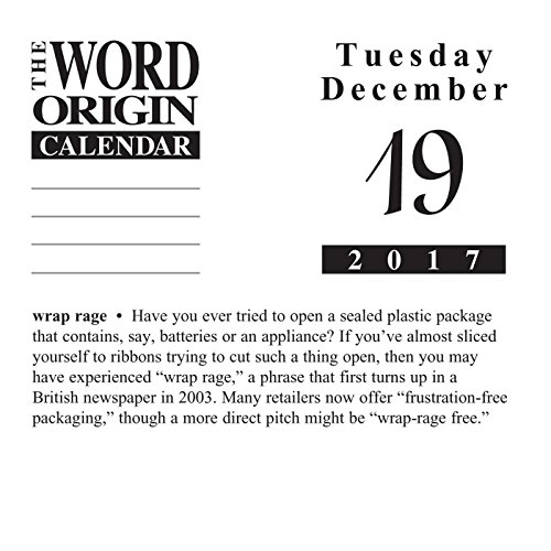-. Feature : Offering language lovers a stimulating year of word trivia, The Word Origin 2017 Calendar's daily vocabulary lessons range from amusing to thought-provoking to sometimes plain bizarre. / Learn the remarkable origins behind obscure words as well as everyday phrases, clichés, and expressions such as a day late and a dollar short, FOMO, bamboozle, noirish, and more. / Includes Holidays and Observances. Perfect for office spaces, bedrooms, classrooms and more! / Keep your appointments and Birthdays organized in one place! / Makes a great gift for friends and family! Dimensions: 6.2" x 5.1"