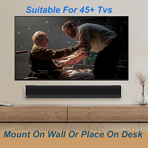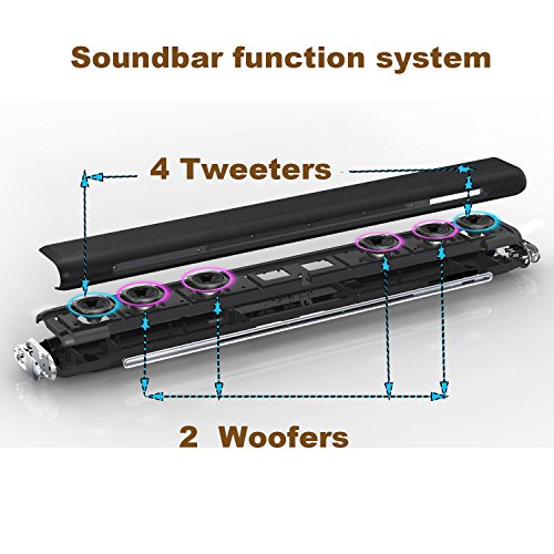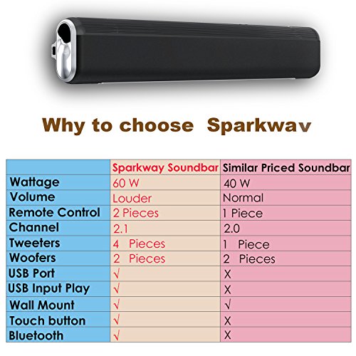 2.【ADVANTAGE HOME THEATER SOUND】loud and clear,stereo mainly,a little bass,independently,can't be working with subwoofer,power come to 60W,so the volume louder than others. Soundbar : channel 2.1,digital amplifier with dsp inside,.have 4x10W loudspeakers, 2x10W bass speakers, can perform better in most of the audio range,when using the USB model,without pairing bluetooth,by the U disk,MP3,cell phone,iPad,laptop,PC,to play the music directly;via remote and touch keys, adjust the volume.