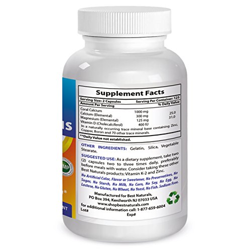 -. Binding : Health and Beauty -. Brand : Best Naturals -. EAN : 0817716014074 -. Feature : For Healthy PH Balance / Important for Bone Health / Supports Optimal enzymatic activity / Contains 73 trace mineral / All Best Naturals products are manufactured in accordance with Good Manufacturing Practices (GMP), among the highest standards in the world -- Proudly Made in USA -- Purity & Potency Guaranteed -. IsAdultProduct : 0 -. Label : Best Naturals -. Manufacturer : Best Naturals -. ProductGroup : Health and Beauty -. ProductTypeName : HEALTH_PERSONAL_CARE -. Publisher : Best Naturals -. Studio : Best Naturals -. Title : Best Naturals Coral Calcium Plus 1000 mg 250 Capsules -. UPC : 817716014074