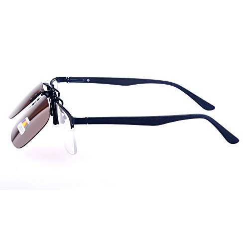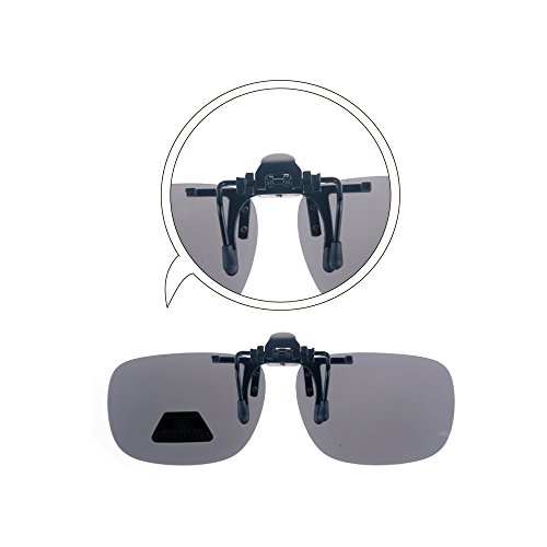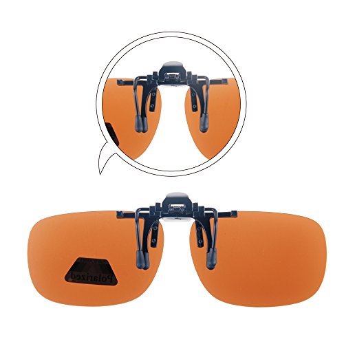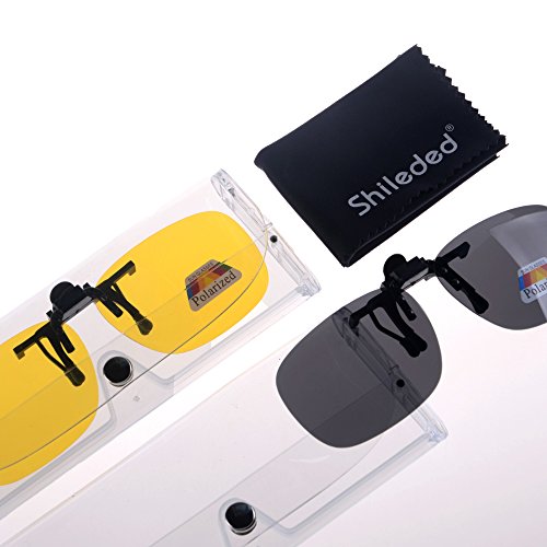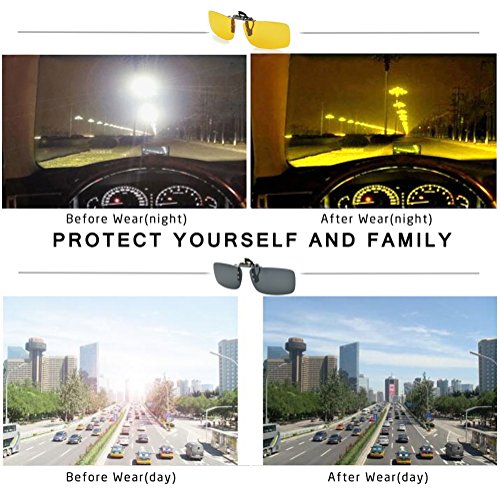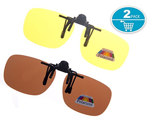 -. Feature : POLARIZED LENSE - Clip on sunglasses L-2.36 inches. H-1.57 inches. Bridge: 0.7 inches .Please choose the lenses bigger than your prescription glasses so the lenses can cover your glasses perfectly. / GREAT FOR OUTDOORS-The Polarized lens of clip-on glasses can improve your vision, 100% UV protection, reduces glare and reflections, great for driving/fishing, and you can enjoy outdoor activities. / QUALITY PLASTIC FRAME-Our flips up sunglasses meet the requirements of the U.S. FDA, which exceeds European Union requirements. / DAY AND NIGHT TO USE-2 PACK, yellow for the night and Grey /Dark Brown /Green for the day. / LIFETIME BREAKAGE WARRANTY&30 DAYS MONEY BACK GUARANTEE-Shileded blue light blocking glasses. You can return and get refunded for any reason. No risk to try.