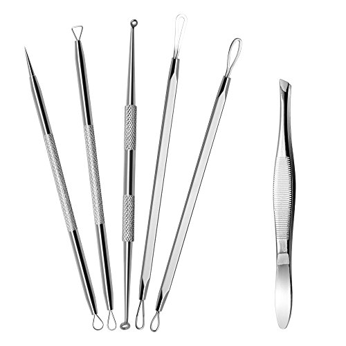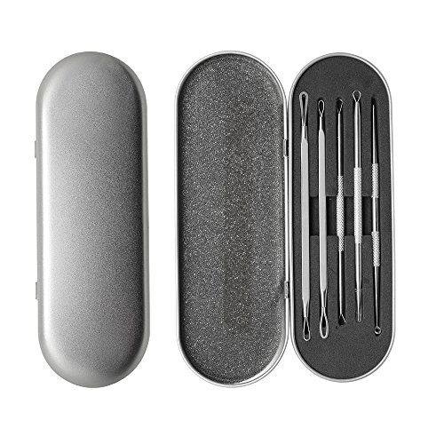 SelfTek 5 Pieces Blackhead Remover Tool Kit Spot Acne Pimple Comedone Extractor Tools with Metal Case and Free Eyebrow Tweezers
