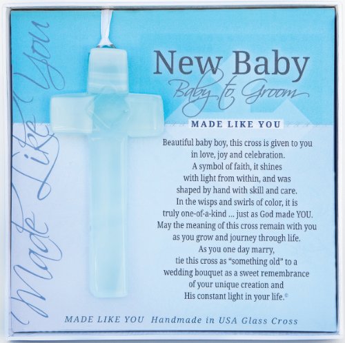 -. Feature : Unique glass cross for a new baby boy / Cross measures 4" and has a white ribbon hanger / Comes in a gift box with P.R.Inted sentiment