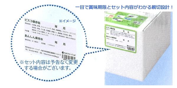 | 製造(販売)者情報 | 【5年保存水】 製造者:五洲薬品株式会社 富山県富山市花園町1-1-5 【ビスコ保存缶】 販売者:江崎グリコ株式会社 大阪府大阪市西淀川区歌島4-6-5 |