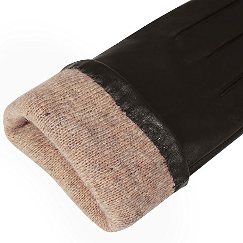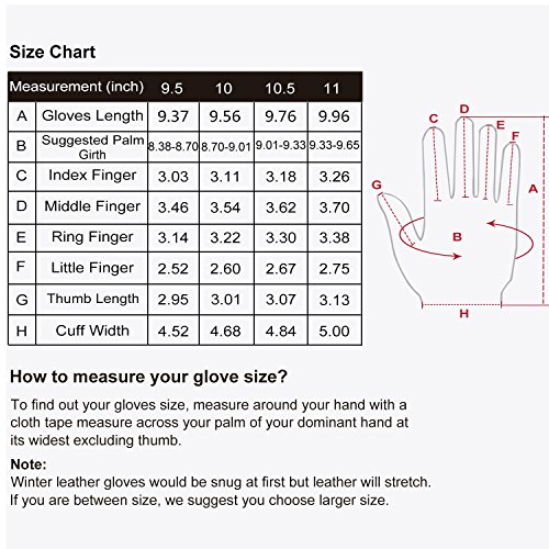 To find out your gloves size, measure around your hand with a cloth tape measure across your palm of your dominant hand at its widest excluding thumb. Winter leather gloves would be snug at first but leather will stretch. If you are between size, we suggest you choose larger size.