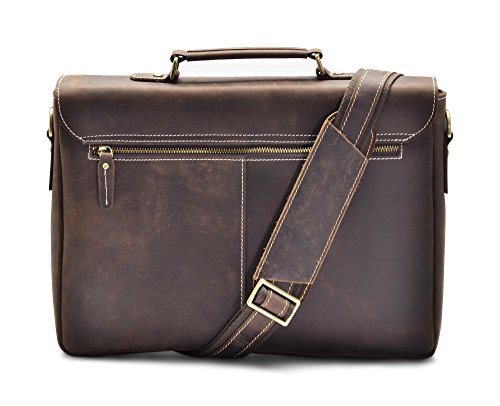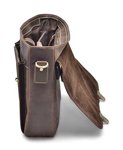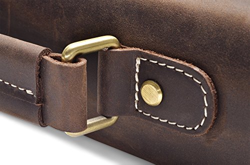 -. Feature : Genuine cow leather treated with Crazy-Horse technique / Solid brass hardware - Durable fabric lining / Adjustable, padded and detachable leather shoulder strap / Electronic compartment for iPad or up to 13" laptop / 1 Zipper pocket in the back, 2 external pockets for easy access , 2 Inside pockets, 2 pen holder, and a zipper pocket