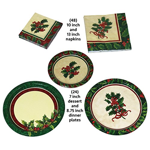 Product Description Beautiful holly berry design for any winter party. Paper plates and napkins. Will include two style of paper plates (as shown). 24 - 9 inch dinner plates, 24 - 7 inch desert plates, 48 drink napkins and 48 - 13 inch dinner napkins. 0