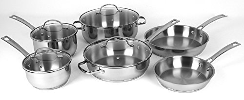 -. Feature : Oneida Stainless Steel 10pc set includes: 1.5qt covered saucepan, 2.5qt covered saucepan, 3qt covered saute pan, 8" fry pan, 10" fry pan, and 5qt covered stockpot. / Non-reactive stainless steel vessels with brilliant mirror polish finish. Aluminum encapsulated in base ensures quick, even heating. / All pieces are induction ready with capacity engravings on saucepans, saute, and stockpot for quick measurements while cooking / Tempered glass lids allow for monitoring the cooking process without lifting lids and releasing moisture / 10 year warranty and dishwasher safe. Oven Safe to 350 degrees Fahrenheit