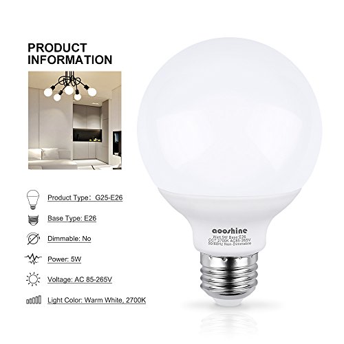 G25 LED Bulb, Aooshine 50W Incandescent Bulb Equivalent Soft Warm White 2700K 5 Watts E26 Base Globe Vanity Makeup Mirror Lights Bulb, Non-dimmable(Pack of 4)