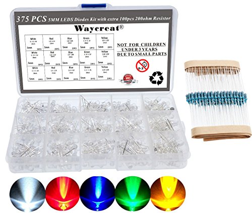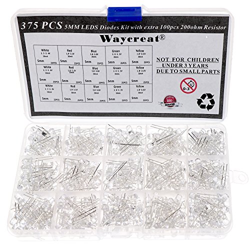5mm LED Diode Kit, Waycreat 375PCS (5 Colors x 75pcs) Clear LED Light Emitting Diodes Color White Red Blue Green Yellow with Resistors