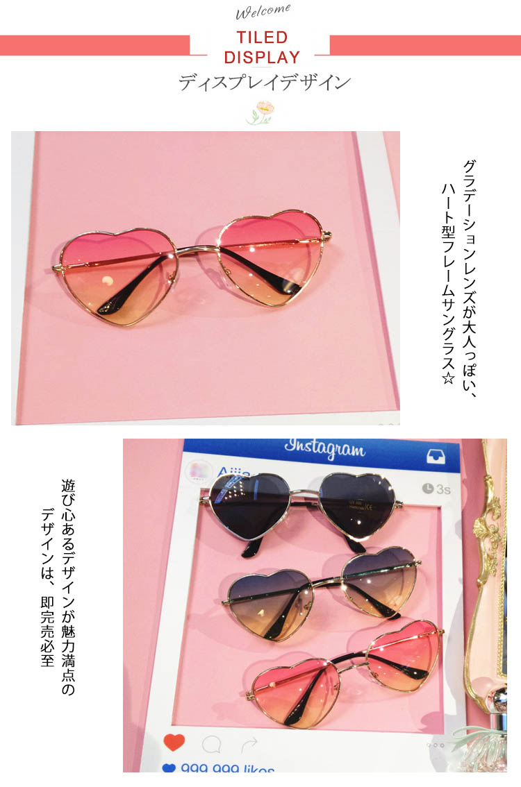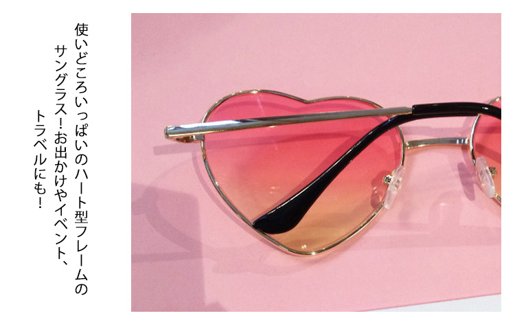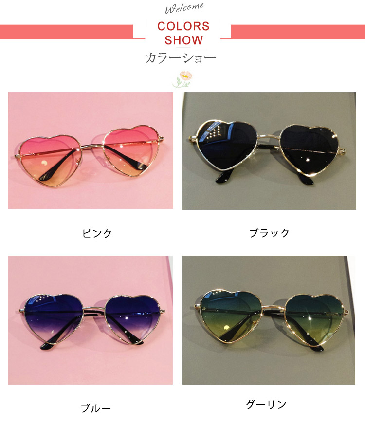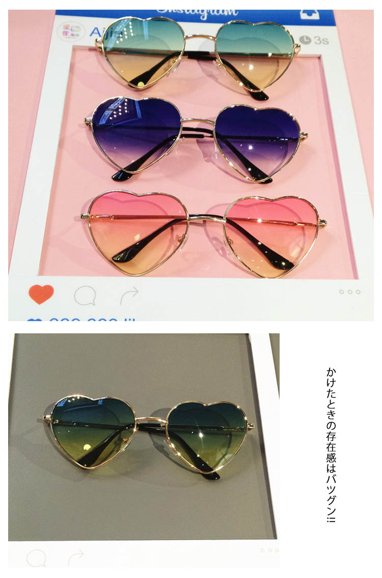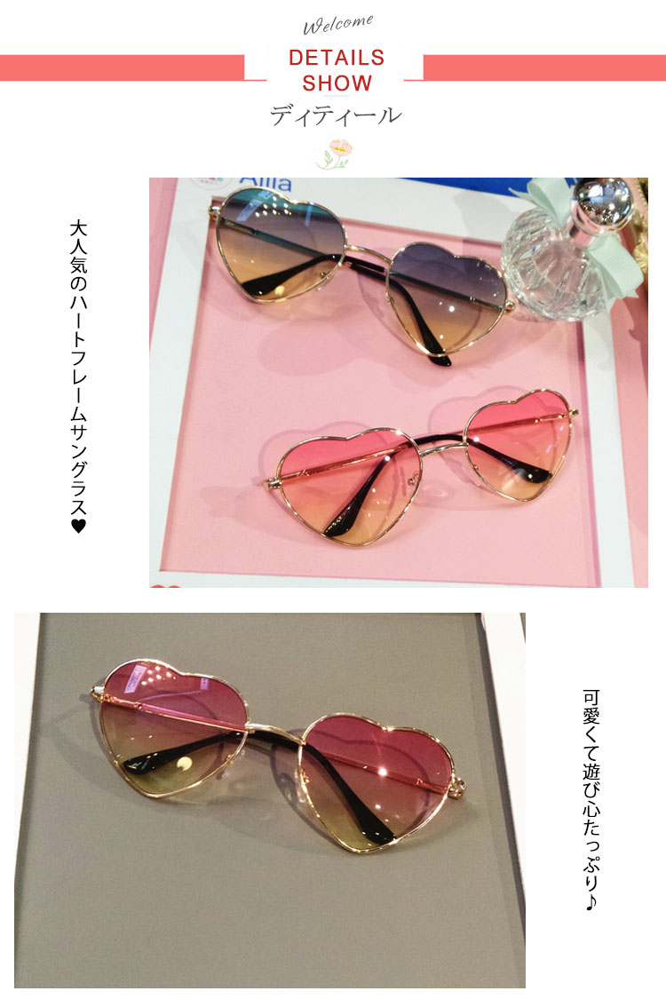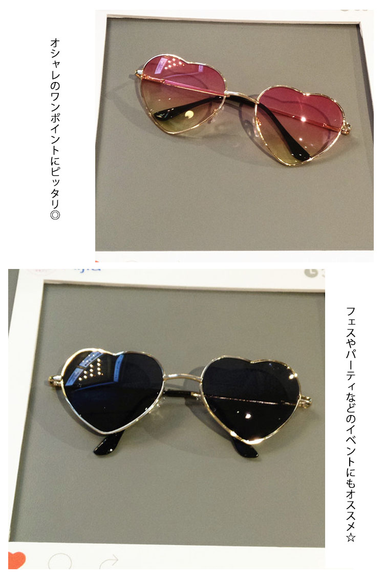 | グラデーションレンズが大人っぽい、ハート型フレームサングラス☆ 遊び心あるデザインが魅力満点のデザインは、即完売必至!!かけたときの存在感はバツグン!!オシャレのワンポイントにピッタリ◎フェスやパーティなどのイベントにもオススメ☆ | |