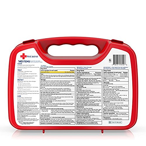 -. Feature : Case Material - Plastic / Catalog Publishing Type - First Aid Kits-Standard / Compliance, Standards - Meets or exceeds OSHA Requirements, ANSI Z308.1-2003 standards / Contains - Adhesive Bandages, Antiseptic Wipes, Burn Cream, Eye Pads, Finger Splints, First Aid Guide, First Aid Tape, Gauze Pads, Gloves, Instant Cold Pack, Motrin, Safety Pins, St. Joseph, Tweezers, Tylenol / Coupon Cannon - 05-14-09