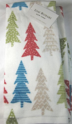 Set of 2 Christmas Kitchen Towels-Multi Colored Christmas Trees 100% Cotton- White Waffle