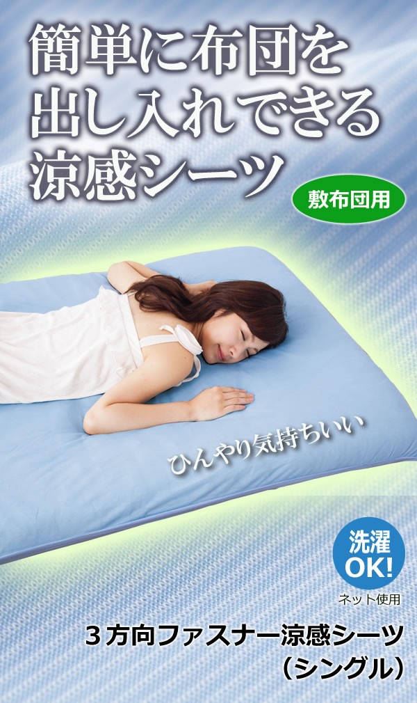 | 涼感素材を使用した肌触りがひんやり気持ちいいシーツです。3方向ファスナーシーツで全開するのでカバーの着脱がスムーズ!ファスナーのスライダーは2個付で開閉もとっても簡単。 |