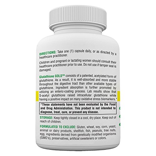 Glutathione Gold is a patent-pending, acetylated form of glutathione. This form is well-absorbed and more stable throughout the digestive tract than other forms on the market. Use of enteric coating further protects stability. Laboratory data showed that Glutathione Gold increased intracellular glutathione and had a positive effect on many oxidative stress biomarkers.