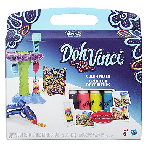 Remix your creativity with swirled DohVinci colors! Fill your own Deco Pop tubes with multiple colors to create bold 3D lines with awesome rainbow effects. With this color-mixing machine, now any Deco Pop tube is refillable. Simply pop the plug out of an empty tube, twist the wheel to choose a color, then press. Add as many colors as you'd like! This complete kit also includes 3 different-colored Deco Pop tubes, an empty tube, and a Pop-Up art project to keep and display. When you've created your own mix, pop the tube into the Styler, then aim, squeeze, and design with swirls of color! DohVinci, Play-Doh, and all related properties are trademarks of Hasbro.Feature