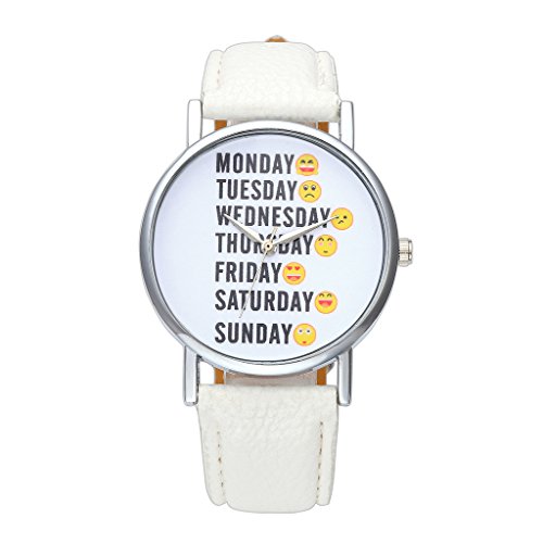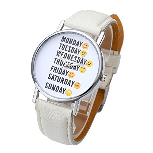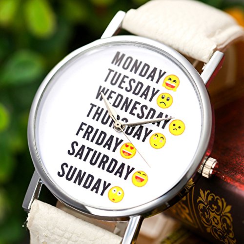 -. Binding : Watch -. Brand : Top Plaza -. Department : Womens -. Feature : Length: 7-8.5" Case Dia: 1.5'' / Fun and unique design. Emoji and week dial. Perfect Christmas gift . / Material: PU/alloy / Comrs with a grey gift bag P.R.Inted brand name "Top Plaza", ready for giving. / Not water resistant, please don't get in touch with water. -. Label : Top Plaza -. Manufacturer : Top Plaza -. Model : ATPUS62353 -. MPN : ATPUS62353 -. PartNumber : ATPUS62353 -. ProductGroup : Watch -. ProductTypeName : WATCH -. Publisher : Top Plaza -. Studio : Top Plaza -. Title : Top Plaza Week Emoji Dial Non Scale White PU Leather Band Fashion Analog Quartz Wrist Watch