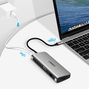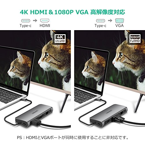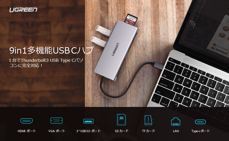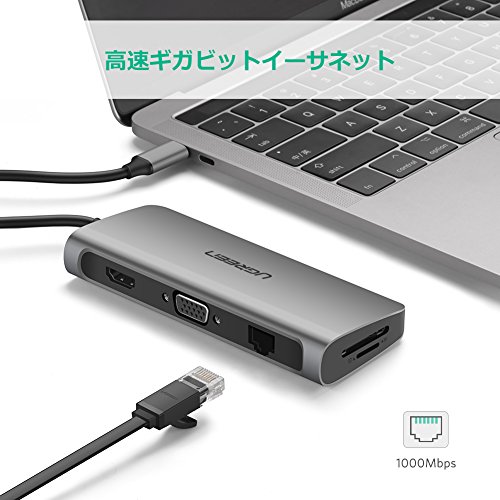 USB Type Cノートパソコンの端子不足問題を解決するために設計された多機能変換アダプターです。Thunderbolt3 Type CポートからPD給電 60W(20V/3A Max)、USB 3.0 3ポート ハブ、有線LAN、4K HDMI、1080P VGA、SD TFカードスロットなどの日常必要とされるポートをすべて備えています。1台でType Cノートパソコンに完全対応!