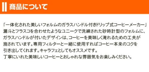직화전자 레인지,오븐,냉동고,식기 건조기 사용 불가.페이퍼 필터는 가능한 한 전용인 것을 추천합니다.전도나 낙하,급격한 온도 변화 등에서 파손하는 가능성이 있습니다. 유리 핸들이 붙었다디자인서는,커피를 좋은 맛 하 ##지기 위한 연구가 행해져 있습니다.
