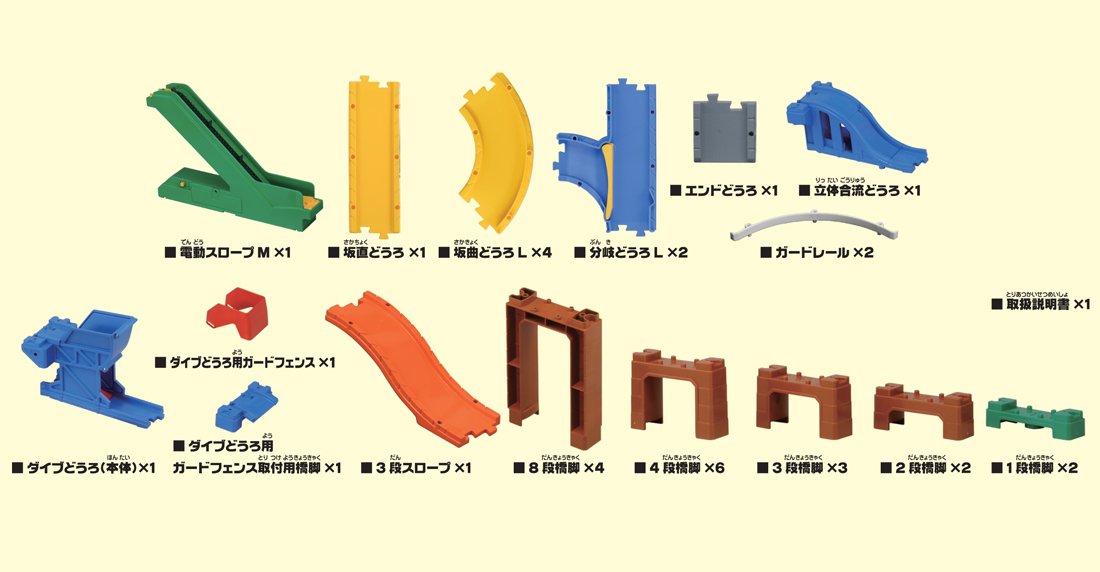 (3), 2-step piers (2), 1-step piers (2), guardrails (2), instruction manuals (1), ※ Tomica (minicar) are sold separately.