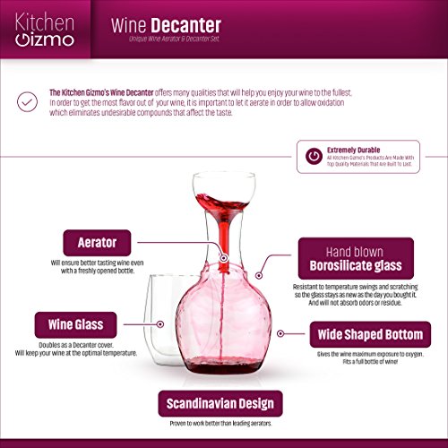 -. Feature : PRACTICAL. Get the Most Flavor Out of Your Wine with the Kitchen Gizmo Wine Decanter. Includes Decanter, Aerator, and a Wine Glass that Doubles as a Decanter Cover. / INNOVATIVE. Wide Shaped Bottom Gives the Wine the Maximum Exposure to Oxygen / STYLE. Contemporary, Sleek and Polished. Scandinavian Design, Proven to Work Better than Leading Aerators. / SMART. Double Walled Wine Glass Will Keep Your Wine at the Optimal Temperature / DURABLE. Made with Top Quality Hand Blown Borosilicate Glass. Will Not Absorb Odors or Residue. Dishwasher Safe.