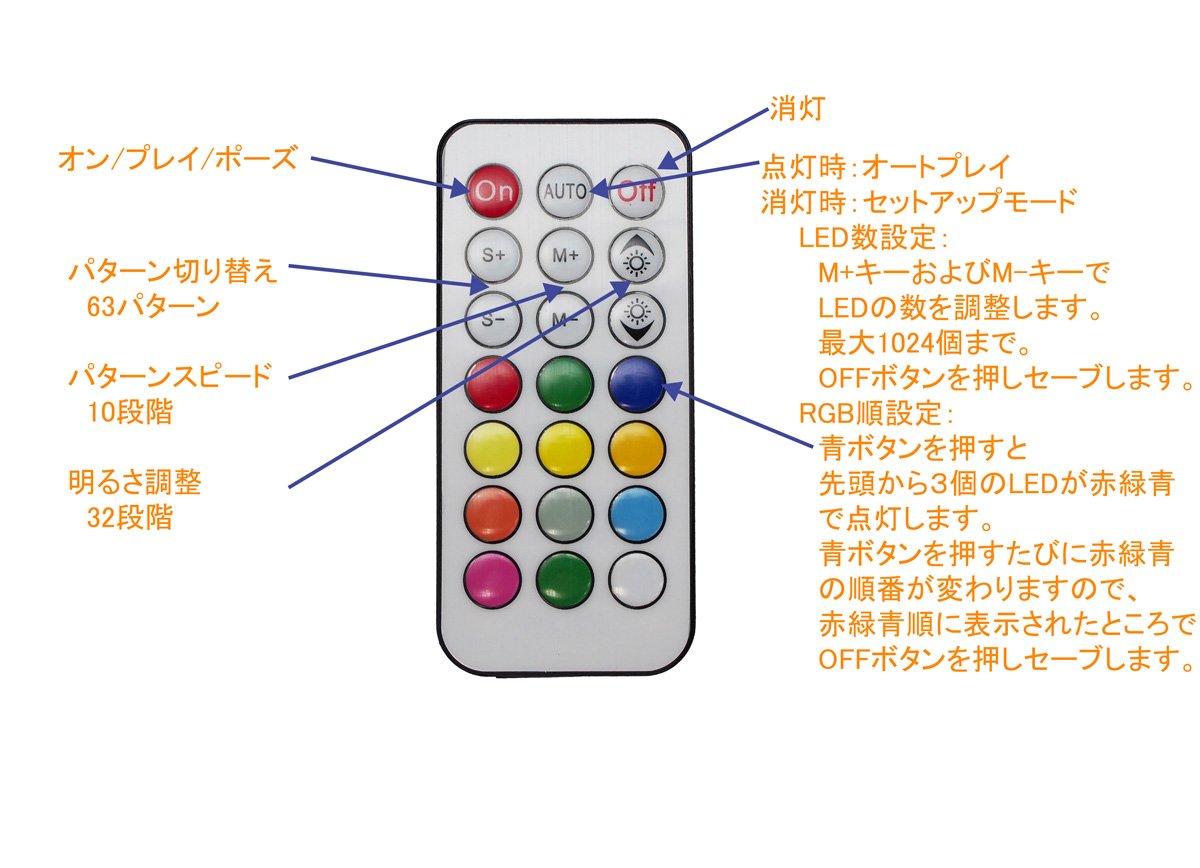 I thought about making a controller of WS 2812 B, but thinking about the trouble of programming with PIC or Arduino and the cost of the remote control, is it very reasonable and affordable? When···. When using it, there are quite a few patterns, it is very beautiful and enjoyable. It is hard to program all these patterns. So I was glad I bought it. Below, what I noticed after using ① Basic 32 patterns make up the pattern. The number of WSs 2812 B to be concatenated can be any number up to 1024, but this controller recognizes that it is 32 × n (1 to 32). By specifying the number of controllers, this part of n can be specified. However, depending on the pattern, this designation is ignored. ② During pattern execution, the brightness can not be changed. ③ Speed can be changed during pattern execution. ④ Consumes about 0.1 A at all times at the time of OFF. ⑤ The controller part is not so strong as to touch it, but it generates a lot of heat. ⑥ The angle recognized by the remote control is quite narrow. It does not react unless it is directed to the light receiving part firmly.