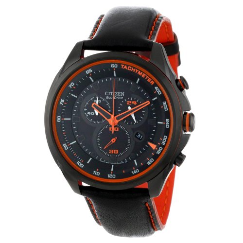 -. Feature : Citizen Eco-Drive is fueled by light, any light, so it never needs a battery / Black ion plated stainless steel case with orange accents / 60 minute chronograph / Drive "D" logo on crown. 12/24 hour time / Water resistant to 330 feet (100 M): suitable for snorkeling, as well as swimming, but not diving