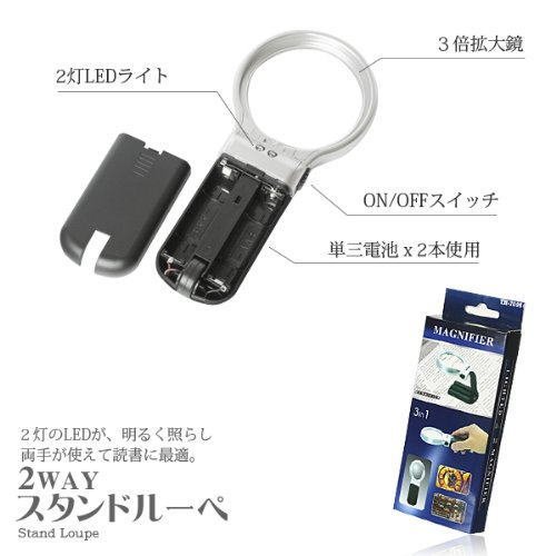 · Product name: 2WAY & 2 LED stand loupe · Specifications: Lens diameter: 62mm Magnification: 3 times LED: 2 white color · Size: Approximately total length 165 × width 76 × thickness 20 mm · Weight: Approximately 73 g (excluding batteries) · Material: