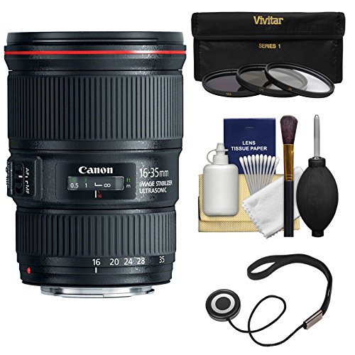 Delivering the ultimate combination of wide-angle, low-light performance, L-series optics and compact construction, the Canon EF 16-35mm f/4L IS USM lens is a phenomenal complement to any EOS SLR camera. Features include: Optical Image Stabilizer; 3 aspheric lens elements; 2 UD lens elements; Optimized coatings to help minimize ghosting; Circular 9-blade aperture; Inner focusing and ring USM; Minimum focus distance of 0.92 ft.; Dust-resistant and water-resistant (when used with an optional Canon PROTECT filter).