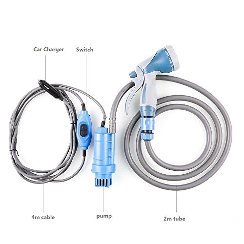 -. Title : Gledto Portable Camping Shower Gear Water Pump 12V Car Cigarette Adapter Outdoor Electric High Pressure Wash Gun Water Hose with 10 Type Sprays for Watering Plants, Cleaning, Car Wash,Pets Showering