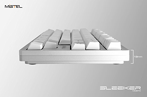 Mistel Sleeker MD870 mechanical Keyboard Size and materieal Mistel Sleeker is a Tenkeyless (80%) mechanical keyboard with solid CNC aluminum case, its design provides you stable and enjoyable experiences while you are typing and gaming. Ergonomics The case comes with simplistic and streamlined; the ergonomic key shapes are designed to provide a comfortable typing experience even during long gaming sessions. The Barocco is perfect for: Typists - equipped with Cherry MX Brown and Blue switches Great for saving space on your desk or traveling light when you need a keyboard that won't let you down. Gamers - equipped with Cherry MX Black or Red switches Accurate and lightning fast key registering, perfect for all your gaming sessions. Programmers - equipped with Cherry MX Brown and Blue switches Specification Layout: 87-key TKL, US ANSI layout Keyswitch: Cherry Mx Switch Material: Aluminum case, stainless steel plate Keycap: Cherry Low Profile PBT Keycap And Dye-Sublimation Printing Polling Rate: 1000Hz Macro Support: No Media Keys: YES Weight: 1.42 kg / 3.12 lbs. Wrist Rest: No Anti-ghosting: Full N-Key rollover on USB Media Keys: Available as a secondary function Dimensions: 140 (L) x 383 (W) x 27 (H) mm Cable(s) Length: 4.9 ft / 1.5 m Software: No Switch Type: Choice of genuine Cherry MX Red, Brown. Blue, Black, and Clear mechanical switch Backlighting: Single color white Interface: USB (Type-C) Warranty: One year Package content 1 x Mistel Sleeker MD870 Mechanical Keyboard with Cherry MX Switch 1 x User Manual 1 x Key Puller 1 x USB Type C and adapter 1 x keycaps setFeature