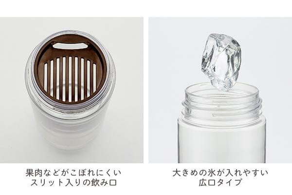 | 果肉などがこぼれにくいスリット入りの飲み口フタなので、フレーバーウォーターなどにピッタリ!!たっぷり飲める600mlタイプで、大きめの氷も入れやすい♪シンプルな構造で洗いやすいのも嬉しいポイントです。 |