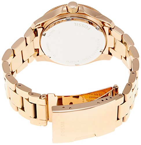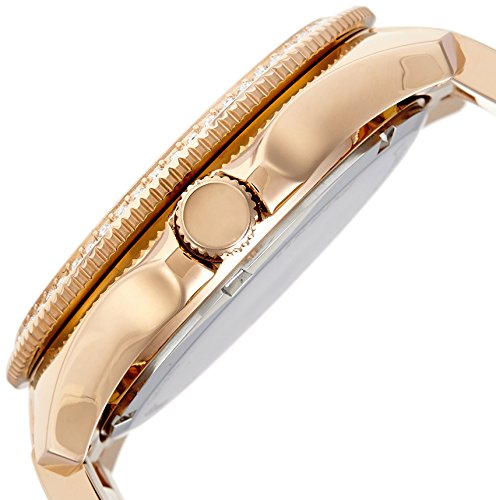 Rose-tone bracelet watch featuring crystal-studded bezel and textured multifunction dial with Roman numeral markers