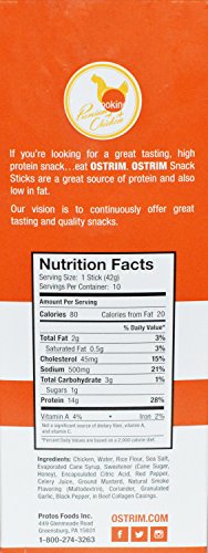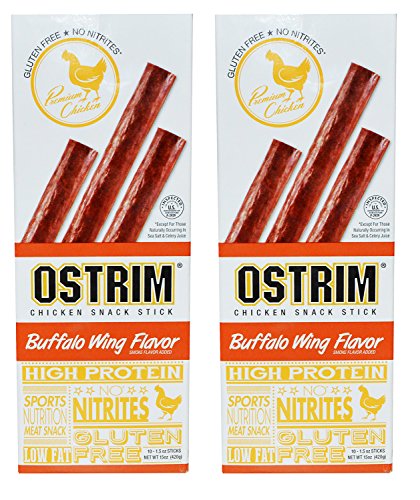 -. Binding : Grocery -. Brand : Ostrim -. Feature : Ostrim Chicken Snack Sticks are High in Protein, Low in Fat, and Low Carb / Gluten Free and Nitrate Free, Made from Premium Chicken / Great Snack for a High Protein Diet / Made with High Quality Ingredients - Meat Sticks are USDA Inspected / Moist and Juicy Chicken High Protein Snack Stick -. IsAdultProduct : 0 -. Label : Ostrim -. Manufacturer : Ostrim -. PackageQuantity : 1 -. ProductGroup : Grocery -. ProductTypeName : GROCERY -. Publisher : Ostrim -. Studio : Ostrim -. Title : Ostrim Chicken Snack Stick Buffalo Wing Flavor High Protein Gluten Free Low Fat No Nitrates Meat Snack