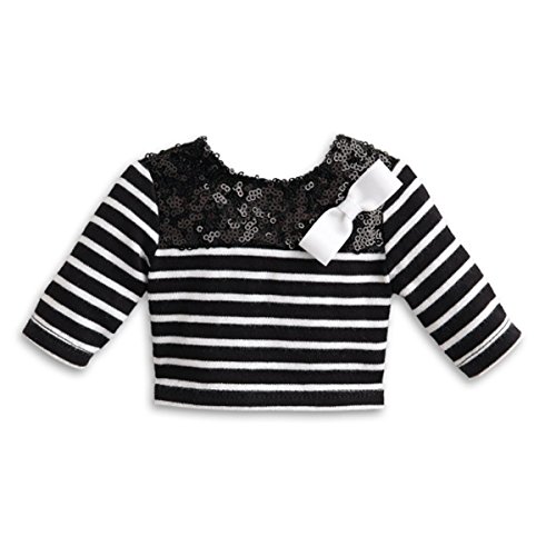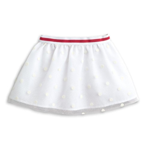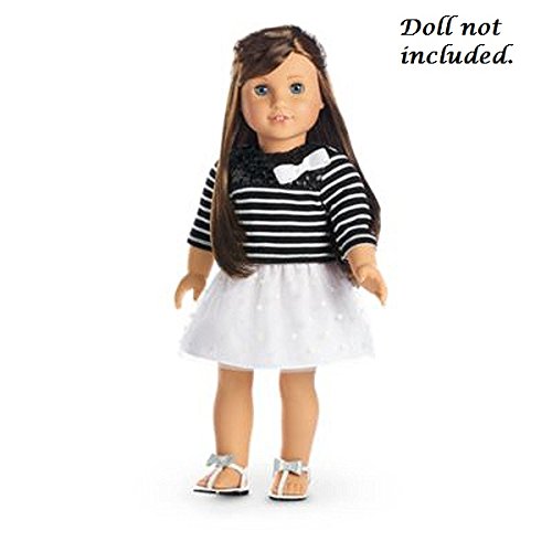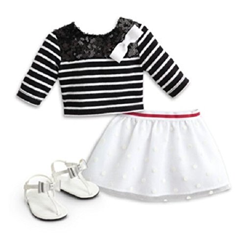 Grace is ready to see the sights in Paris! This French-inspired outfit features: A striped tee with three-quarter sleeves, sequin embellishments, and a pretty white bow at one shoulder A full white skirt with a layer of polka-dot mesh Strappy white sandals with silvery bows