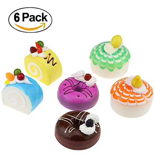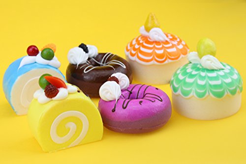 Full hand size,2* cream cakes(2.6 x 2.6 x 2.6 inches),2* donuts(2.8 x 2.8 x 1.8 inches),2* swiss rolls(2.2 x 1.4 x 2.6 inches).PS:RANDOM COLORS.