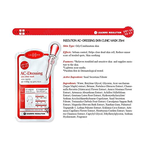 -. Feature : Leaders Insolution AC-Dressing Skin Clinic Mask / 0.84 Oz/25ml x 10ea / Sebum Control + Clear Dead Skin Cells + Reduce Minor Scars of Trouble Spots + Skin Soothing / Relieves troubled n sensitive skin while supplying moisture to skin / Lighten acne marks n reduces large pores