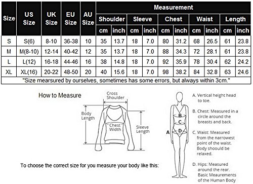 Specifications: Please check your measurements to make sure the item fits before ordering. 1. Use similar clothing to compare with the size. 2. Choose larger sizes if your size are same as the flat measurement Size chart Size S-----Shoulder 13.7"------Sleeve 7.0" -----Cheest 31.2"------Waist 26.5"-----Length 23.8" Size M-----Shoulder 13.7"------Sleeve 7.0" -----Cheest 34.3"------Waist 28.1"-----Length 23.8" Size L-----Shoulder 14.8"------Sleeve 7.0" -----Cheest 35.9"------Waist 30.4"-----Length 24.2" Size XL-----Shoulder 15.6"------Sleeve 7.0" -----Cheest 38.2"------Waist 32.8"-----Length 24.6" 0