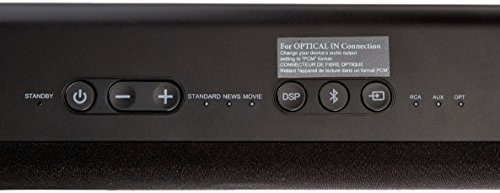 Feature : 31-inch 2.0 channel sound bar with remote control-ideal for any 32-inch or larger TV / Bluetooth technology offers seamless streaming from Bluetooth-enabled mobile phone, tablet, or computer / Dual full-range stereo speakers for powerful audio; up to 95 dB of expansive audio and crystal-clear sound / 3 sound modes: Standard for TV programs, News for more intelligible dialog, and Movie for optimized soundtracks