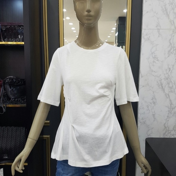 면 100%의 기본형 티셔츠입니다티셔츠이긴 하지만 어깨와 허리쪽에 라인따라 잡힌 핀턱으로인해블라우스느낌이 더 강한 상품입니다안으로 넣어 입지않아도 자연스런 셔링이잡혀 여성스럽게 연출 가능한 상품입니다?