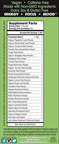 A Tasty, Healthy Drink Mix That Makes You Feel Great! Add 1 Scoop to 20 oz. of Water, Hot or Cold, your Favorite Beverage, or Your Rockin Wellness Smoothie. Unbelievable Healthy Caffeine Free Energy!Feature