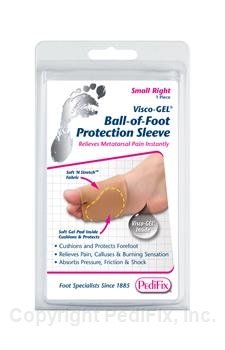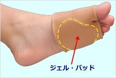 A stretchy nylon supporter tightly fixes a thick soft gel pad under the lateral arch (metatarsal head, thumb finger.bulb near the base of the toe's finger)
