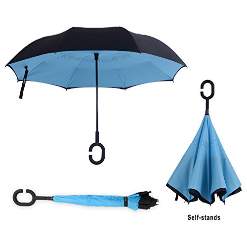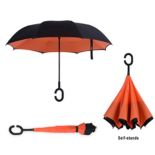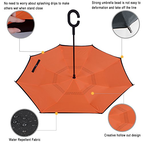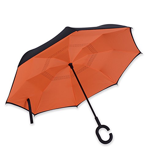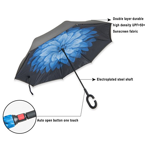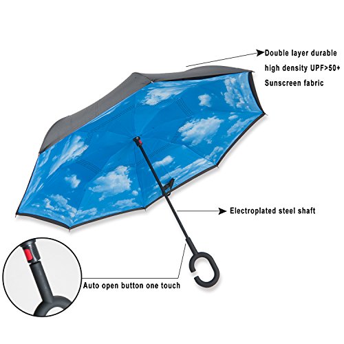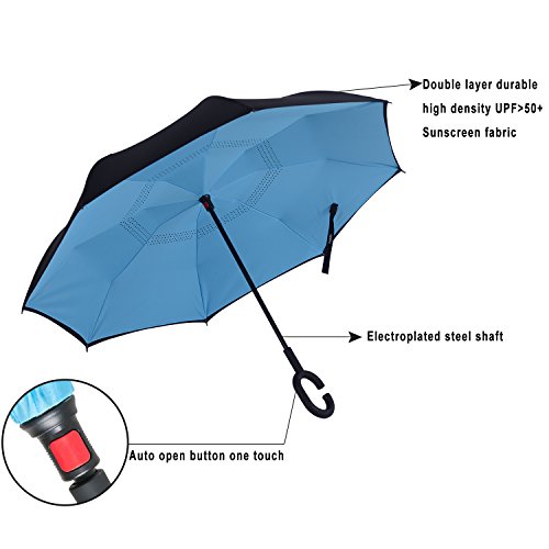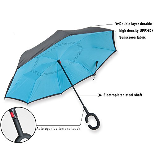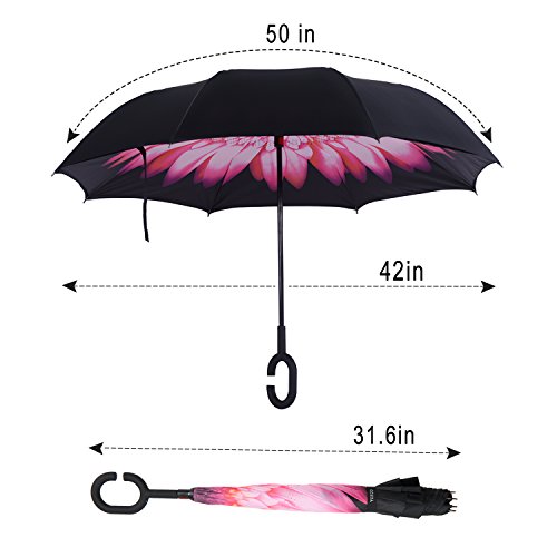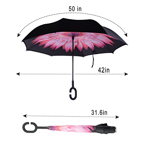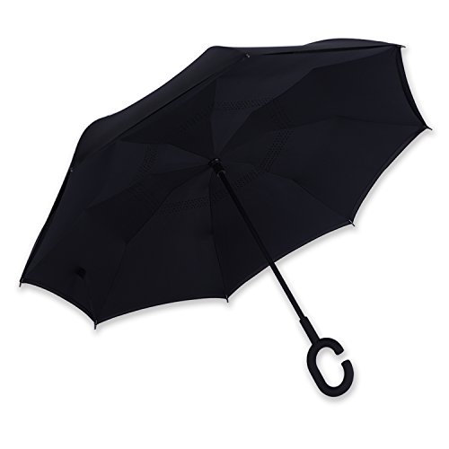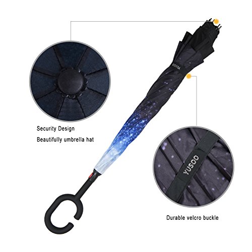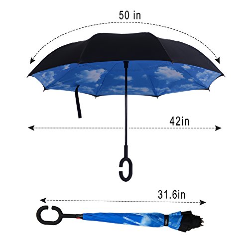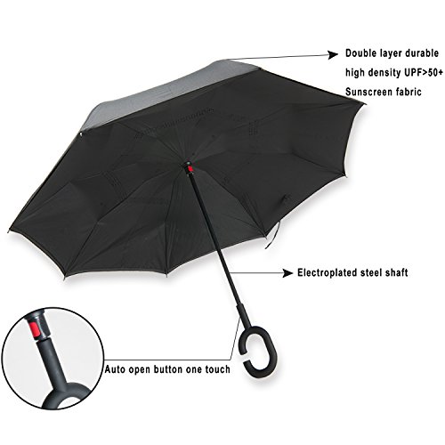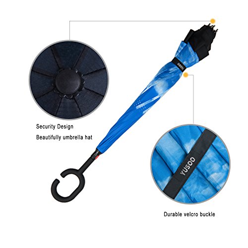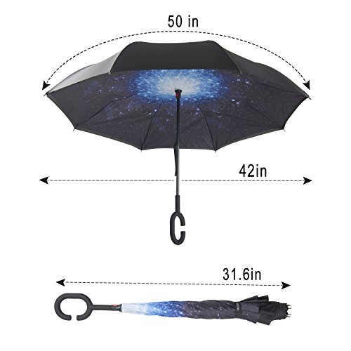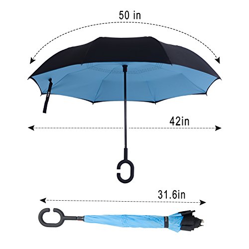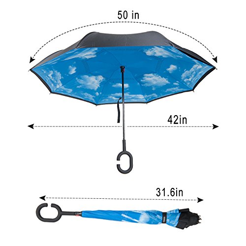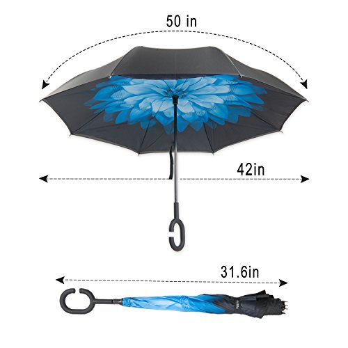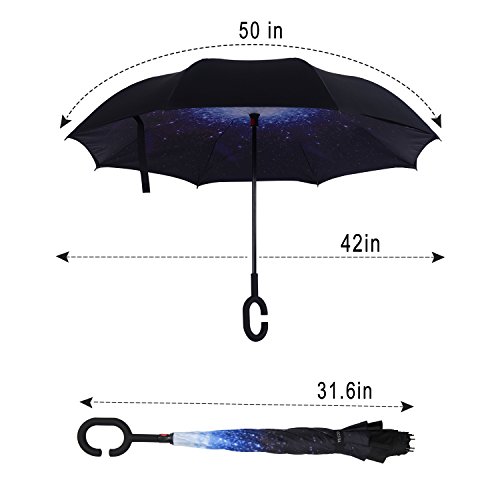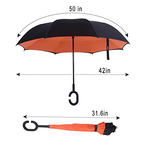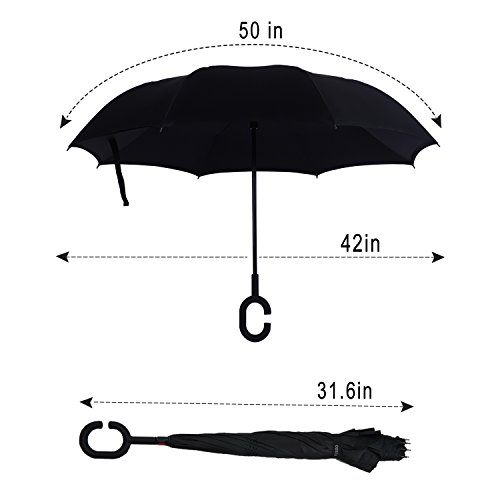 Product Description YUSOO UMBRELLA UMBRELLA SIZE: Open size: 50*42*31.6 inches; Close size: 31.5in(Length) Best size for both home use, car use, and even take it to Travel. REVERSE FOLDING UMBRELLA: Reverse open/close design, when close umbrella, water stay inside, no wet seat and trousers. Innovative design allows you to close it in an inverted/reverse direction, which means the outside layer will become the inside layer after closing, so you can put it directly anywhere in a car or a room without making the seat or floor wet, and even other people standing beside you on a bus or the subway will not get wet, either. HANDS FREE HANDLE: The C-shaped hand grip allows you to free your hands. C-Handle-hands-free for holding baby, mobile,briefcase etc. STAND UP: The inverted umbrella can stand up on its own, no worry where to put. The inverted umbrella can stand up on its own, ideal for when you have nowhere to prop your umbrella up against. HIGH QUALITY MATERIAL: 1.Rib-Electroplated steel shaft and premium resin-reinforced fiberglass ribs; 2.Cloth-Double layer durable high density UPF>50 Sunscreen fabric; 3.Handle-soft-feel plastic feels rubberized comfortable. The double layer inverted umbrella made of sunscreen fabric pongee cloth, durable black electric ribs and double layer ribs, make the umbrella more strong, enhance its windproof and UV proof effect. 0