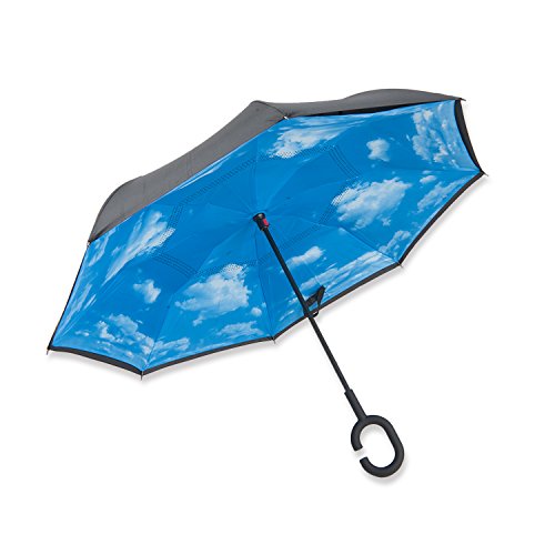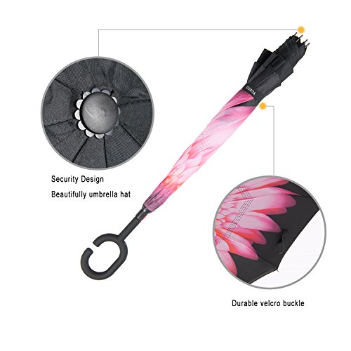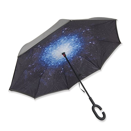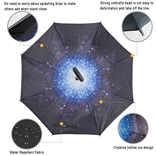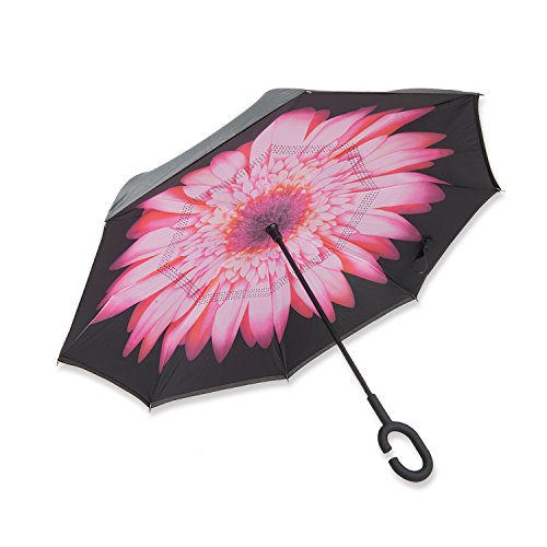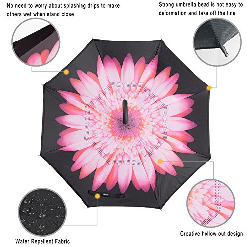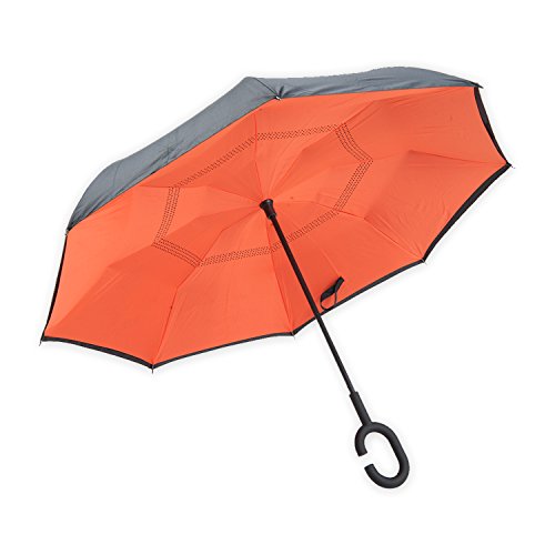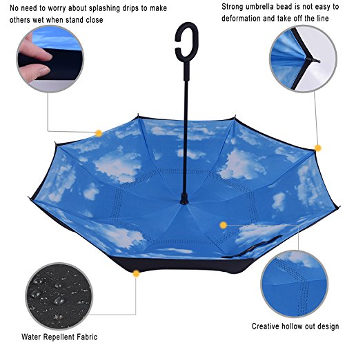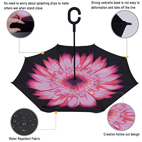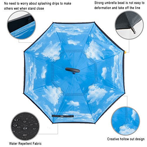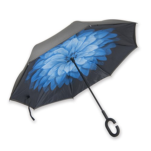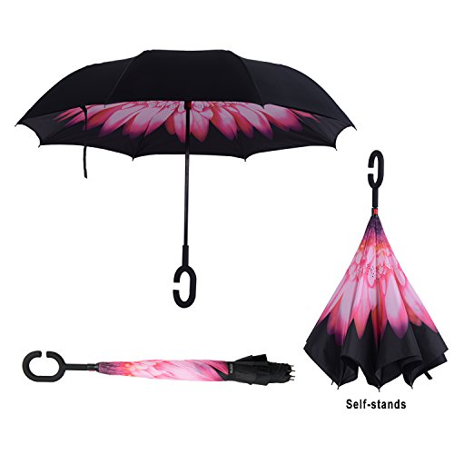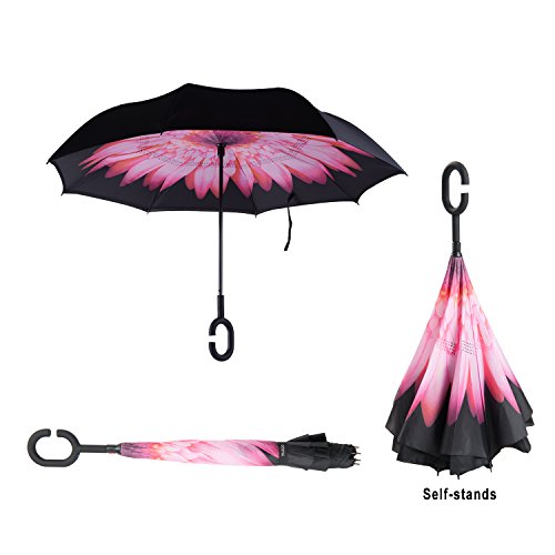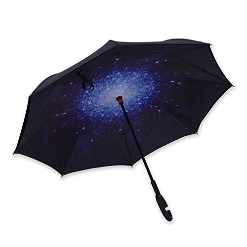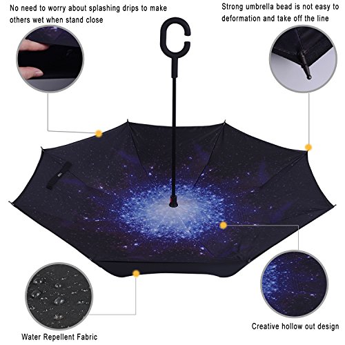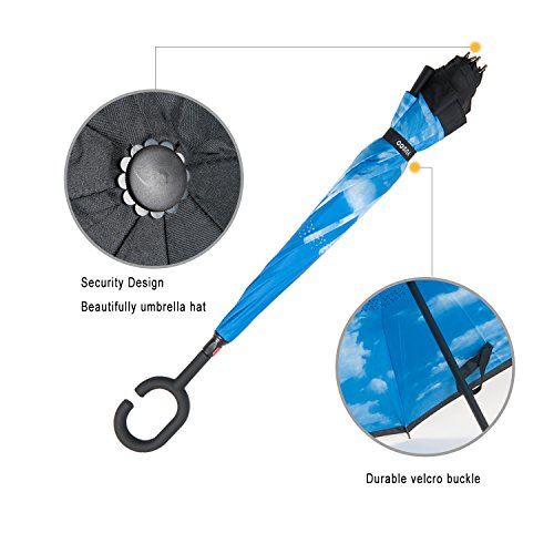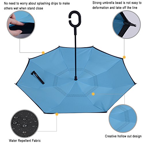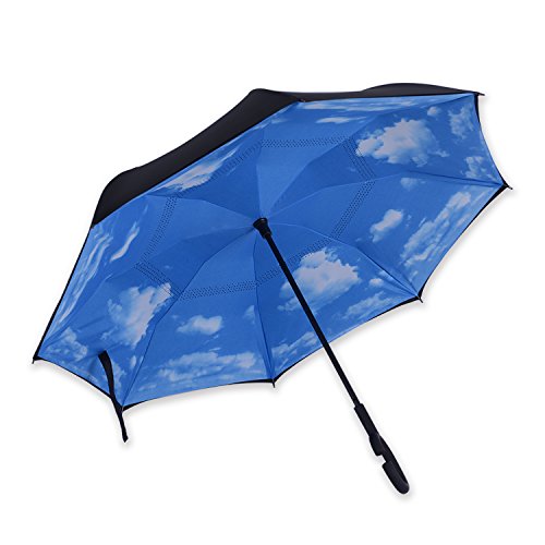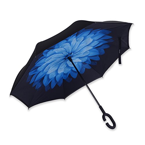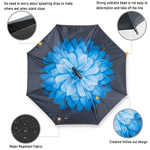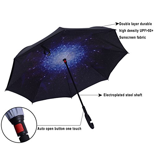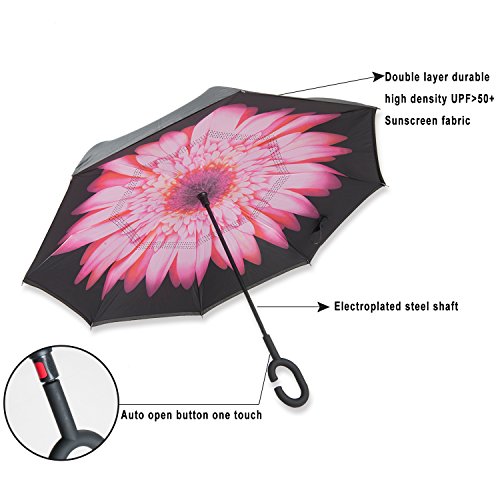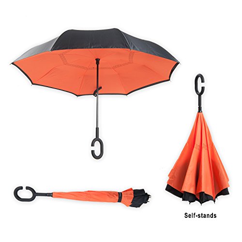 Product Description YUSOO UMBRELLA UMBRELLA SIZE: Open size: 50*42*31.6 inches; Close size: 31.5in(Length) Best size for both home use, car use, and even take it to Travel. REVERSE FOLDING UMBRELLA: Reverse open/close design, when close umbrella, water stay inside, no wet seat and trousers. Innovative design allows you to close it in an inverted/reverse direction, which means the outside layer will become the inside layer after closing, so you can put it directly anywhere in a car or a room without making the seat or floor wet, and even other people standing beside you on a bus or the subway will not get wet, either. HANDS FREE HANDLE: The C-shaped hand grip allows you to free your hands. C-Handle-hands-free for holding baby, mobile,briefcase etc. STAND UP: The inverted umbrella can stand up on its own, no worry where to put. The inverted umbrella can stand up on its own, ideal for when you have nowhere to prop your umbrella up against. HIGH QUALITY MATERIAL: 1.Rib-Electroplated steel shaft and premium resin-reinforced fiberglass ribs; 2.Cloth-Double layer durable high density UPF>50 Sunscreen fabric; 3.Handle-soft-feel plastic feels rubberized comfortable. The double layer inverted umbrella made of sunscreen fabric pongee cloth, durable black electric ribs and double layer ribs, make the umbrella more strong, enhance its windproof and UV proof effect. 0