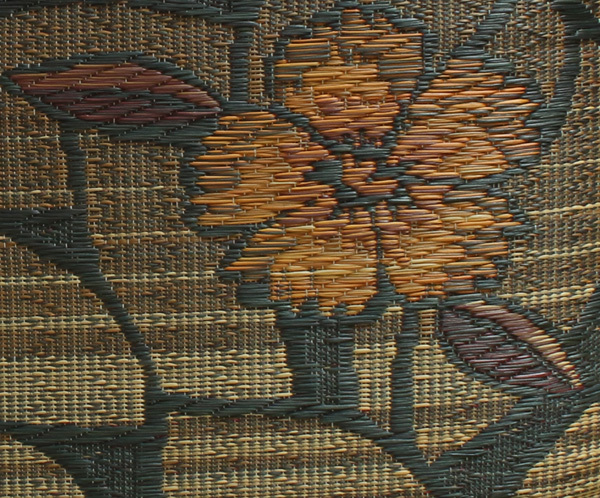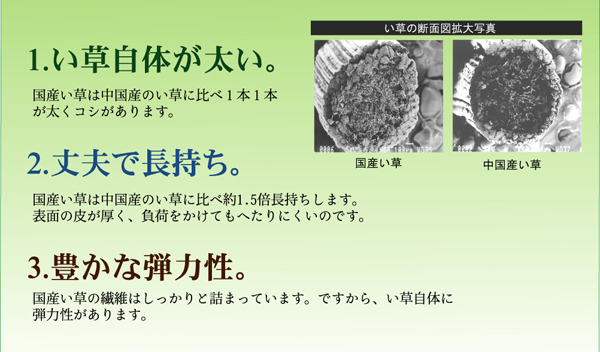 縦糸の本数が多い袋織りという技法で繊細な柄を出しています。折れ曲がりが複雑なので長いイ草を使用しないと切れてしまいます。縦糸が密なので、しっかりとして破れにくいのが特徴です。国産(九州産)のい草を使用しています。一本一本が太く、表皮が厚く繊維がキメ細かいので弾力性があり、耐久性に優れています。い草には空気の自然浄化作用、湿度の調節作用などがあります。また汚れにくく、使用するうちに黄金色に変化し味が出ます。い草に青森ヒバ加工を施しています(抗菌、防臭効果)。中材はウレタンをフェルトでサンドした三層構造で、適度なクッション性があります。