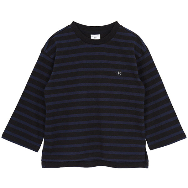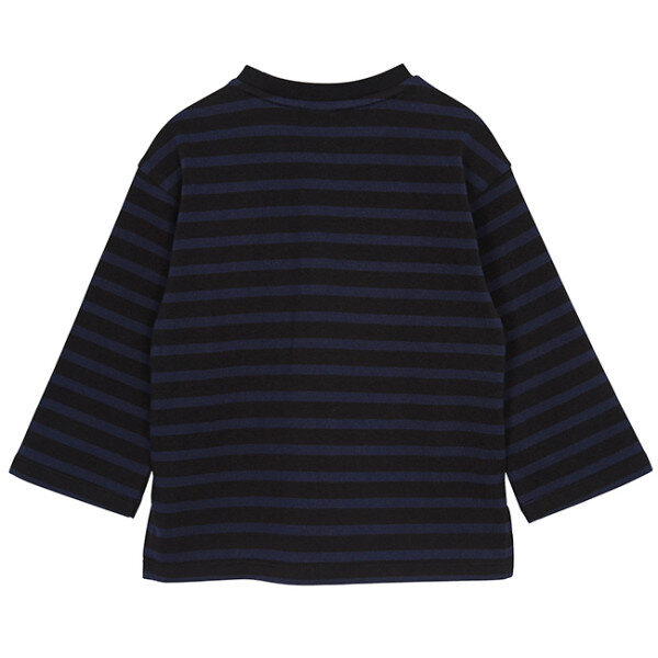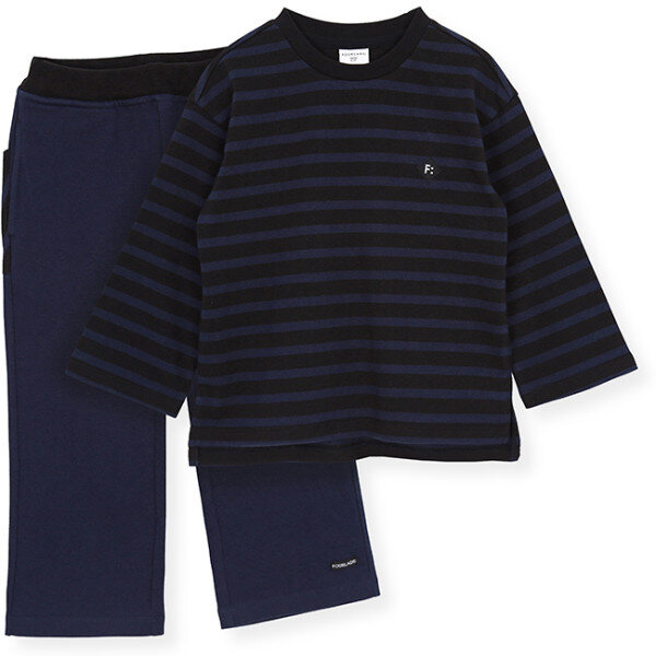 블루와 블랙 조합의 가로 스트라이프와 통이 넓은 팬츠로 구성된 상하세트에요. 살짝 도톰한 느낌의 스판성 좋은 면소재로 하여 가볍게 착용하기 좋은 아이템이에요.