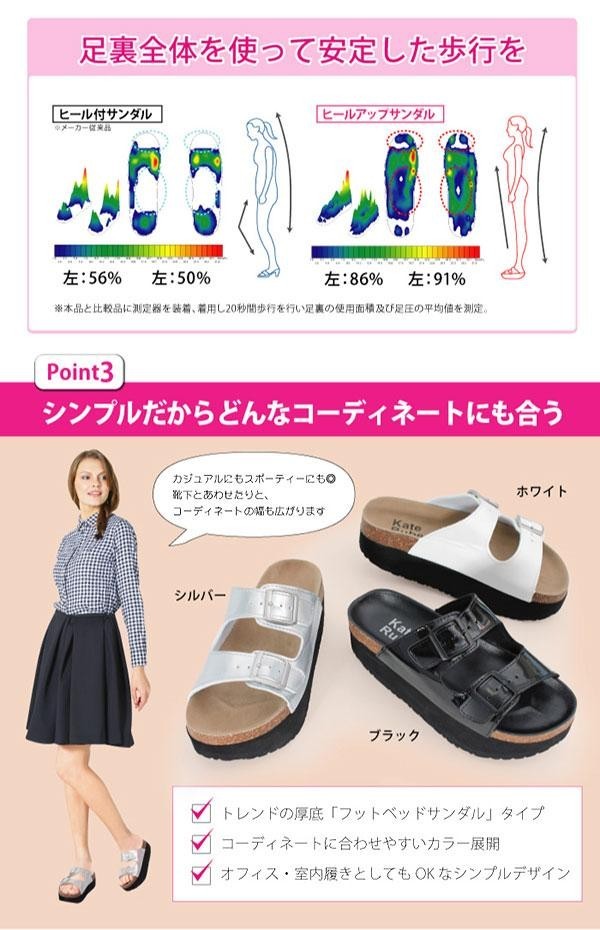 | 素材・材質 | アッパー:合成皮革 インソール/ブラック:合成皮革、シルバー・白:ポリエステル コルク:TPR アウトソール:EVA(合成樹脂) |